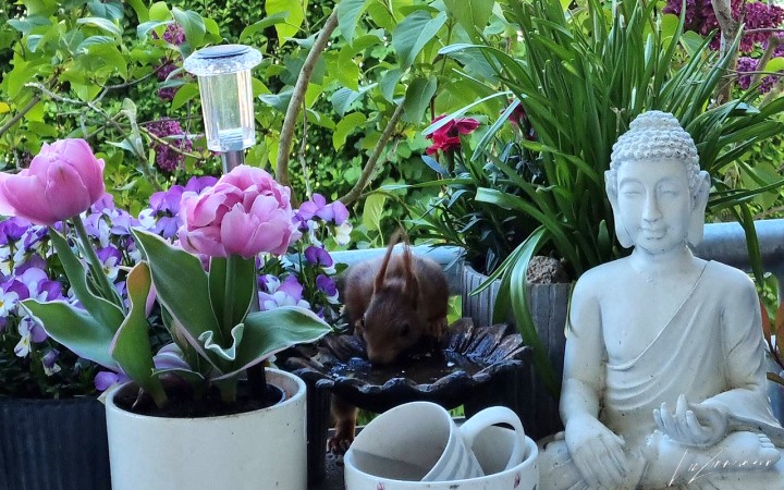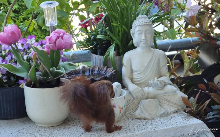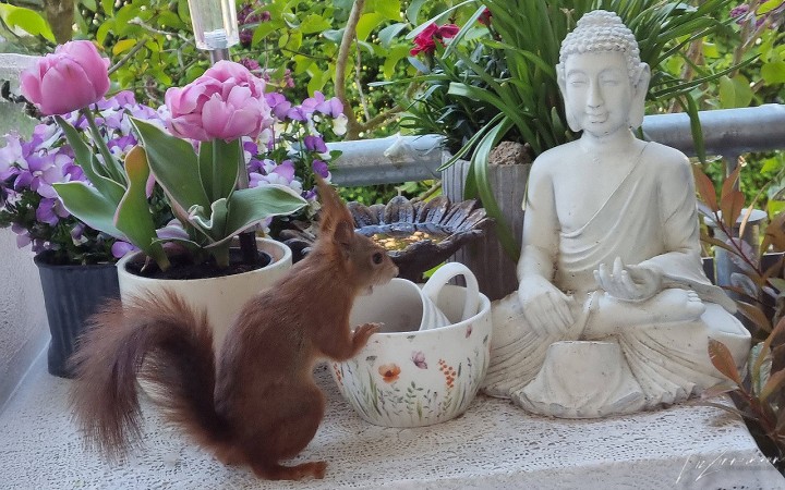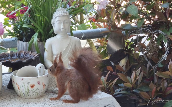 Nachdem ich bei einem Facebook Eintrag gerade bedauert hatte das die Eichhörnchen nicht mehr kommen hatte ich sehr zu meiner Freude diesen Besuch 20 Minuten später!