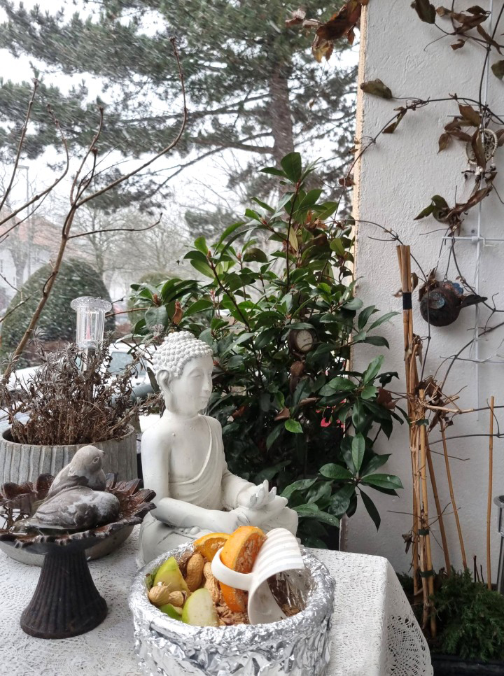 So habe ich heute auch den Vogelfutter Teller auf dem Balkon wieder aufgefüllt ......